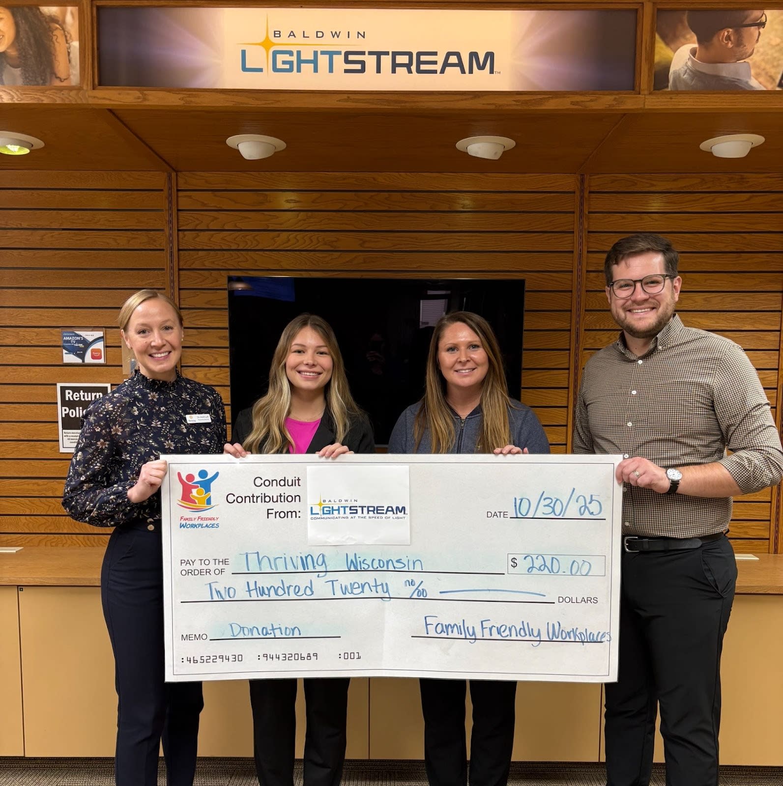 Baldwin, Wisconsin – Family Friendly Workplaces (FFW) is pleased to announce that Baldwin LightStream, a Gold-Level certified Family Friendly Workplace, recently made an annual conduit contribution to Thriving WI. This meaningful contribution reflects Baldwin LightStream’s ongoing commitment to supporting families and strengthening the local community.
