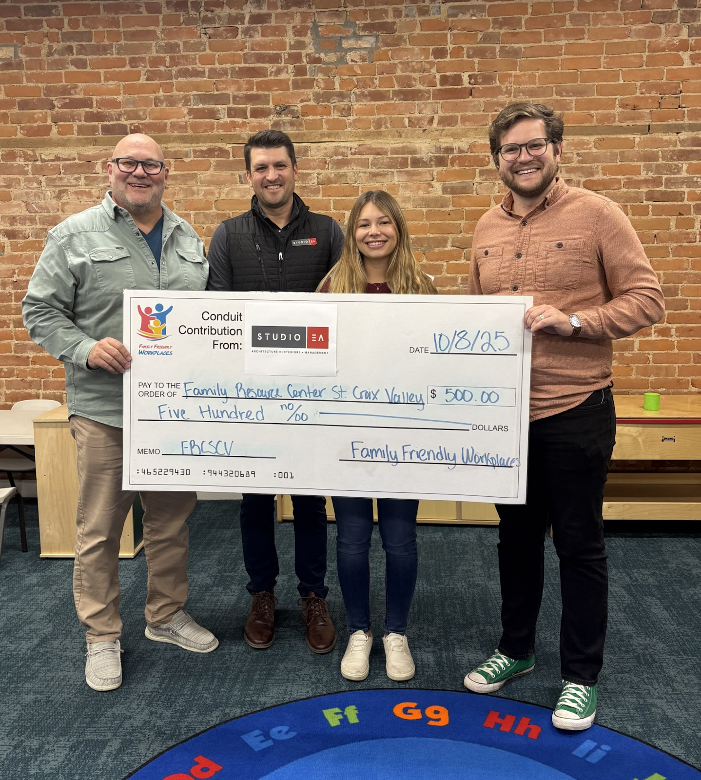 Baldwin, Wisconsin – Family Friendly Workplaces (FFW) is pleased to announce that Studio EA, a Gold-Level certified Family Friendly Workplace, recently made an annual conduit contribution to the Family Resource Center St. Croix Valley. This meaningful contribution reflects their ongoing commitment to supporting families and strengthening the local community.