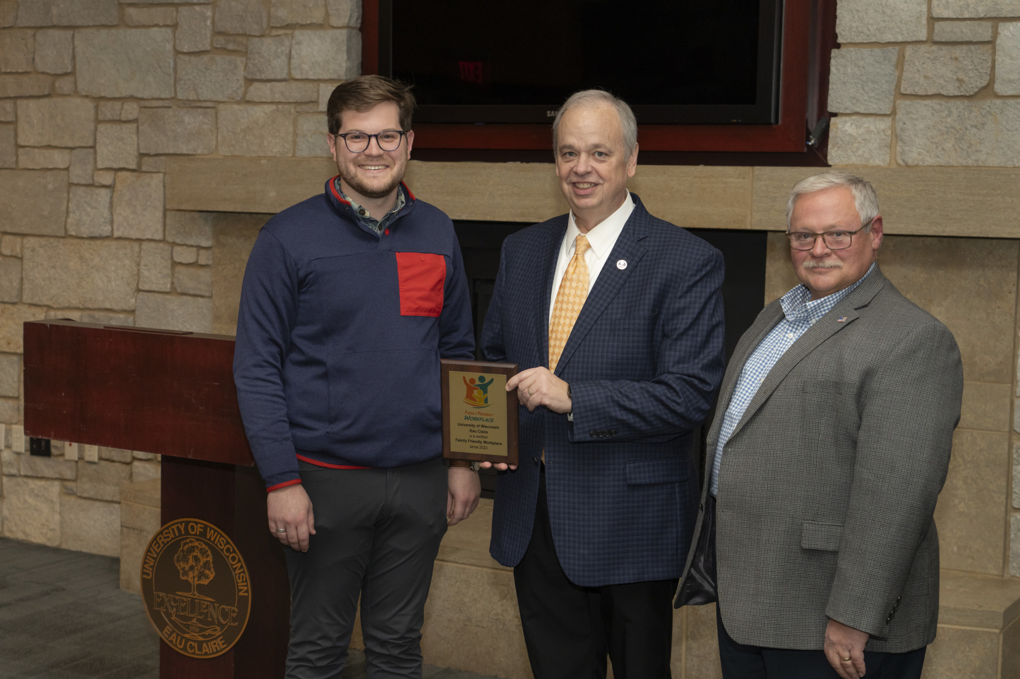 Chancellor James Schmidt receives the gold-level certification plaque from Neil Kline, left, Family Friendly Workplaces executive director, and Mark Tyler, right, founder of the organization, December 1st at UW-Eau Claire.