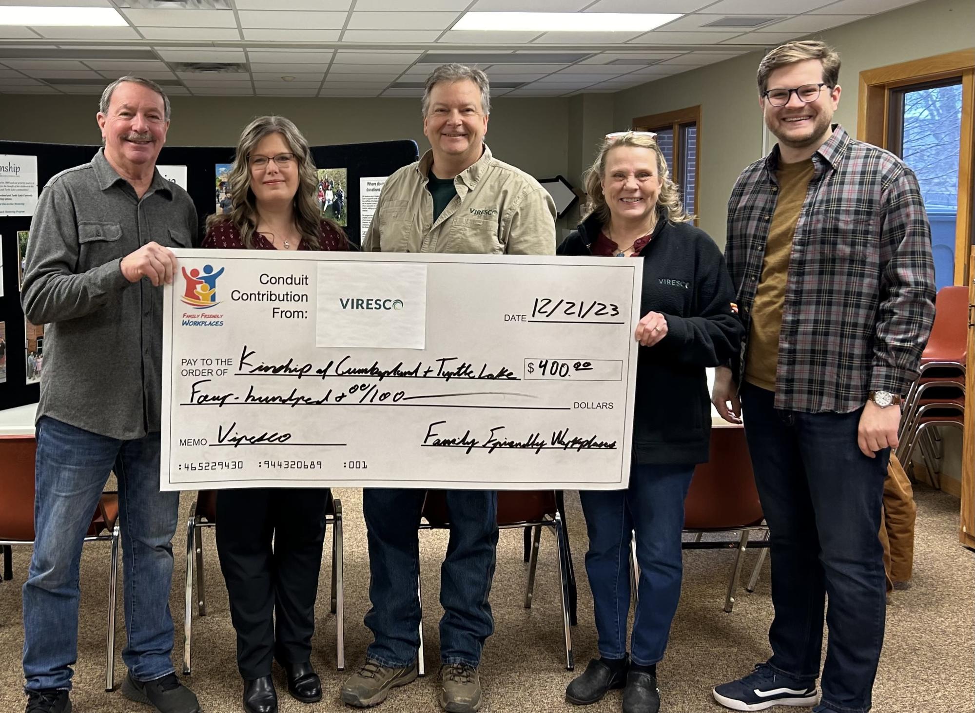 In alignment with the certification, VIRESCO has committed to an annual contribution to a nonprofit organization that supports families. This year, VIRESCO has chosen to direct its conduit contribution to Kinship of Cumberland & Turtle Lake, a nonprofit dedicated encouraging every child to reach their highest potential through the development of one-to-one mentoring relationships which foster companionship and guidance, self-esteem and life skills. VIRESCO staff are also mentors and participants with Kinship, and have experienced the enduring benefits Kinship provides regional families.